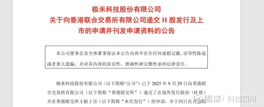 9月30日,科创板上市公司极米科技发布公告称,公司已于2025年9月29日向港交所递交了在境外发行股份(H股)并在港交所主板上市的申请,并于同日在香港联交所网站刊登了本次发行的申请资料。