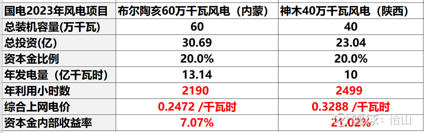 这是国电电力2023年审议通过的两个项目数据,从数据看风电项目的年均利用小时数差异大,年均利用小时数布尔陶亥是神木的87%,布尔陶亥电价是神木电价的75%,可以看出各省电力补贴力度不同,电价差异大。从项目看资本金内部收益率21%和7%差异非常大,但总体都还可以。分析电力公司看来要关注上网电价,以及年均利用小时数。