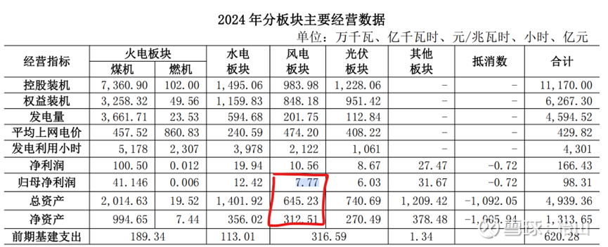 再看看国电电力2024年财报,国电电力主力是火电,风电占比较小,风电总资产645亿,净资产321亿,净利润10亿,归母净利润7.77亿,风电的净资产收益率ROE为2.5%,收益率比较低。