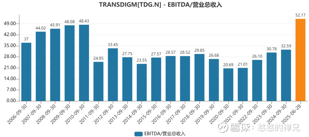 这种独特的商业模式,造就了TransDigm不错的盈利能力。它的EBITDA利润率常年维持在30%左右。