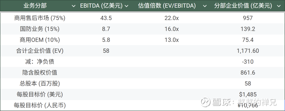 业务拆分:根据公司披露,售后市场贡献约75%的EBITDA,剩余25%我们合理分配给国防(15%)和OEM(10%)。
