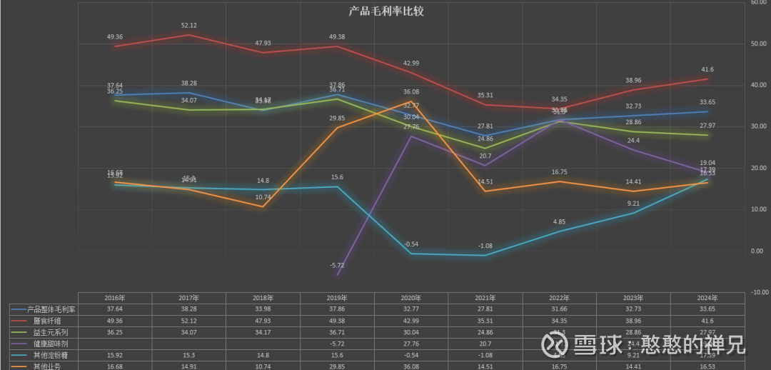 膳食纤维系列 (红线):作为核心业务,其毛利率走势与公司整体趋势高度一致,是影响整体毛利率的决定性因素。从2017年的高点(52.12%)持续下滑,在2021年达到最低点(35.31%),2024年回升至41.6%。