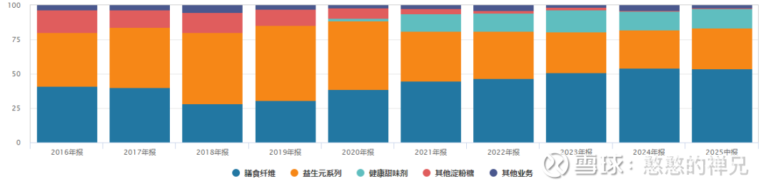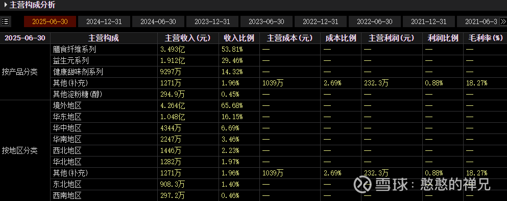 收入来源:公司的营业收入主要来自三大产品系列的销售:膳食纤维、益生元和健康甜味剂。从地域分布来看,海外(境外)市场已成为越来越重要的增长引擎。