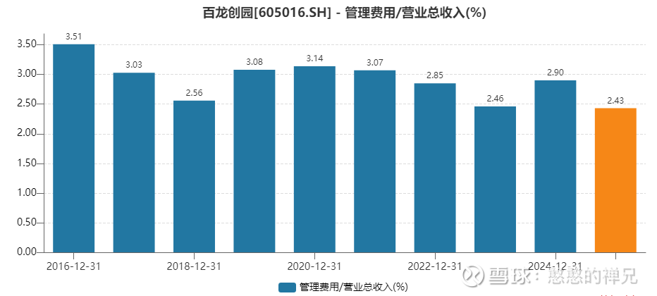百龙创园的管理费用控制展现了极高的效率和稳定性。虽然公司的绝对管理费用随着规模扩张而自然增长,但其占收入的比例(管理费用率)却长期保持在一个非常稳定的窄幅区间内,并略有下降趋势。这有力地证明了公司拥有一个可扩展(Scalable)的、高效的内部管理体系,展现了优秀的经营杠杆效应。