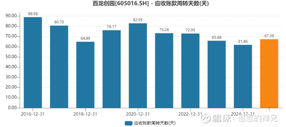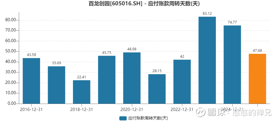 核心看点是2022-2023年的飙升。接近3个月的付款周期,充分说明了在此期间,百龙创园的行业地位和议价能力达到了前所未有的高度。这与我们之前分析的公司业绩爆发期高度吻合。作为供应商的重要大客户,百龙创园能够争取到极为宽松的付款条件,从而将大量的营运资金留在自己手中,支持业务扩张。