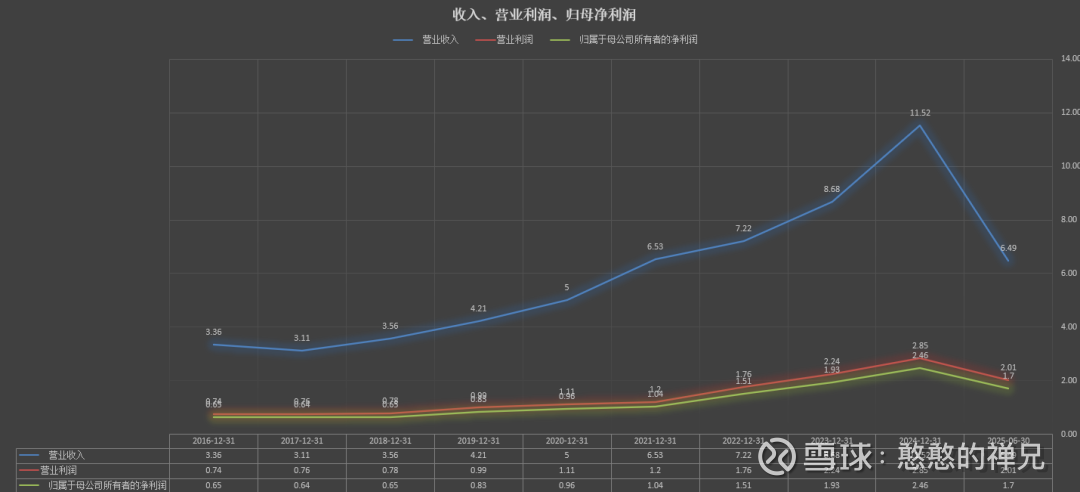 利润同步增长: 营业利润(红线)和归母净利润(绿线)在此期间也同步小幅增长,表现非常平稳。