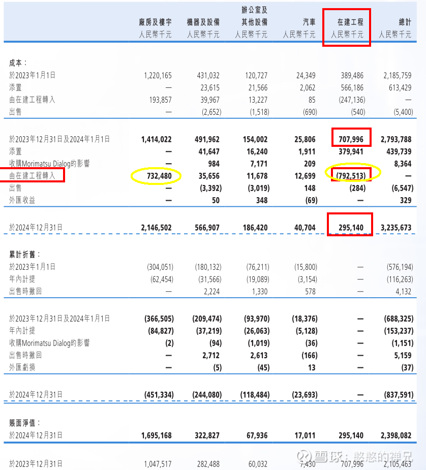 数据表中最核心的变动是“由在建工程转入”这一行。2024年内,有高达7.93亿人民币的在建工程项目完成了建设,转为了可以正式使用的固定资产。
