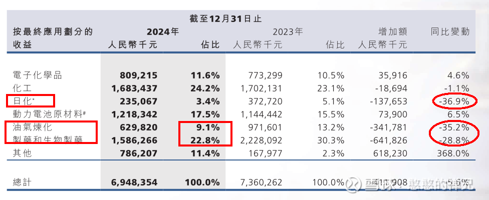 日化、油气炼化、制药和生物制药 这三个板块是导致公司总营收下滑的主要原因,它们的按年跌幅均非常显著,分别为 -36.9%、-35.2% 和 -28.8%。特别是「制药和生物制药」,其营收绝对值下降最多(-6.4亿人民币),并且营收占比从去年的30.3%大幅缩减至22.8%,失去了第一大业务板块的地位。