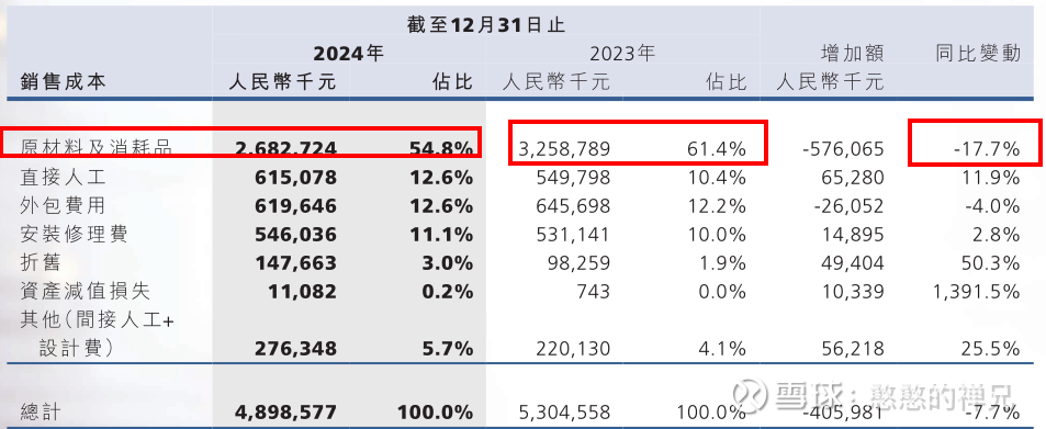 2024年年报中,公司披露的信息显示,公司原材料占销售成本的比例是54.8%。同比2023年61%的占比下降17.7%。