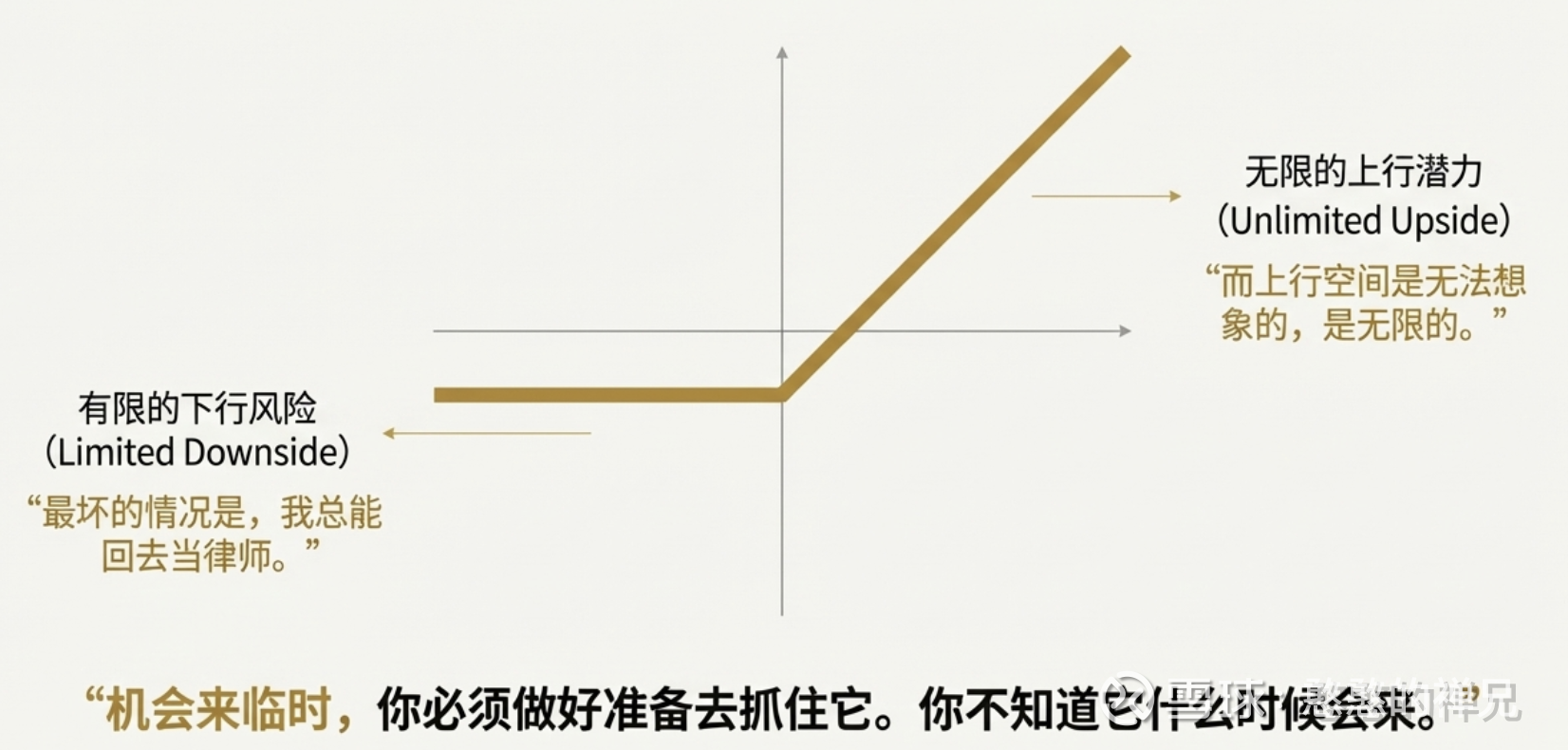 什么意思?就是当你做一个决策时,下行风险是有限且可控的,而上行的潜在回报却是巨大的,甚至是无限的。 当年对他来说,最坏的结果无非是创业失败,回去继续做律师或银行家,损失的只是一两年的薪水。但如果成功,回报将是不可想象的。这,才是投资决策的精髓。