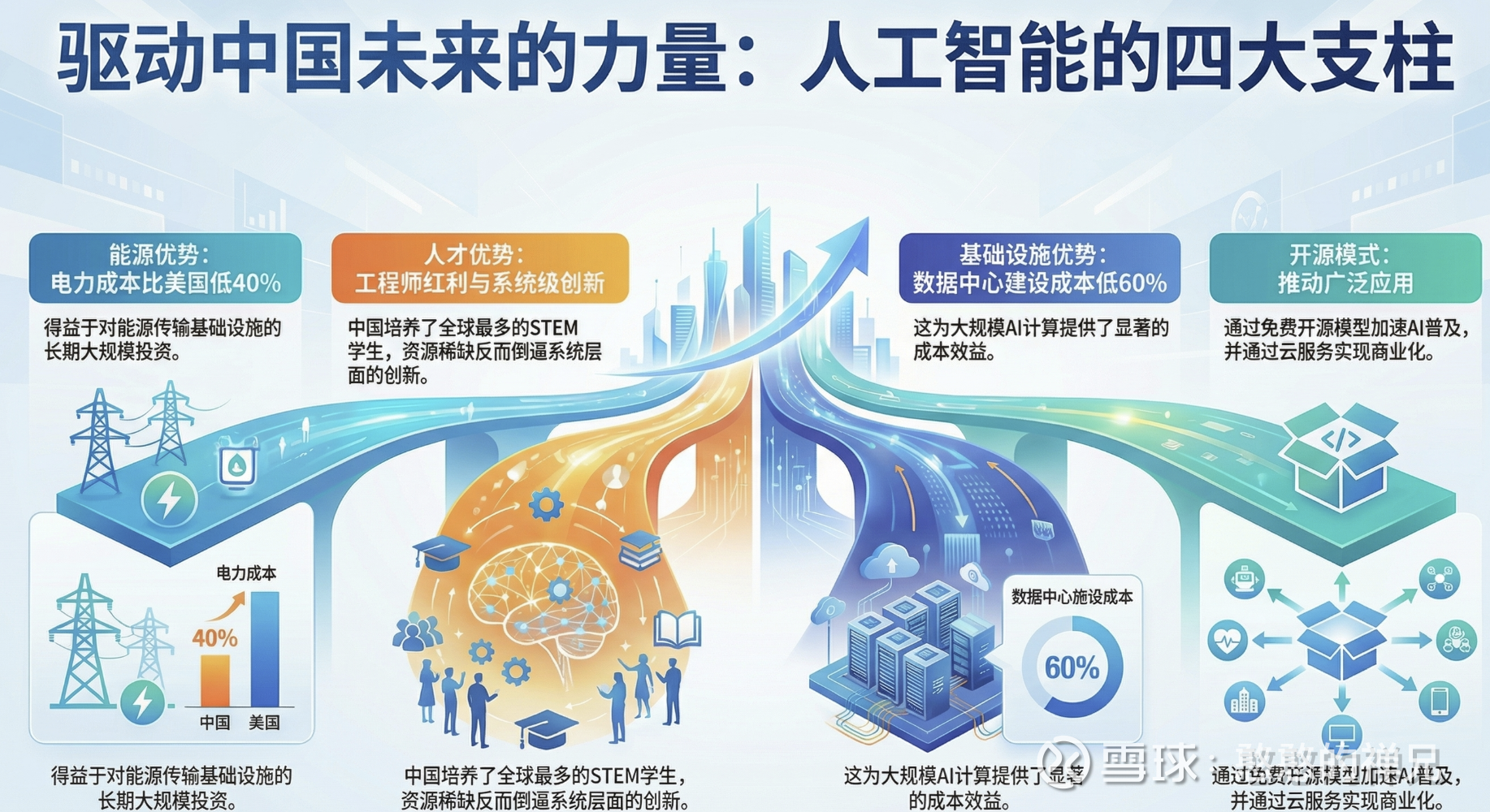 观点二:中国的“全栈优势”。 蔡崇信认为,在AI普及战中,中国拥有一些被低估的“基础设施”优势,我将其总结为以下几点: