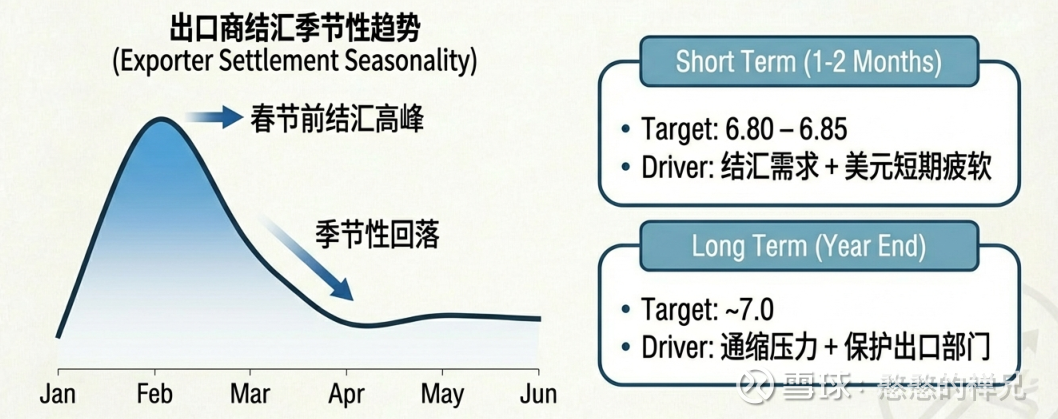 这主要是季节性因素。马上春节了,出口企业要把赚的美元换成人民币发年终奖、结货款。这就是刚需“结汇潮”。加上美元最近这一波走弱,一季度人民币冲到6.8甚至6.85是有技术面支持的。