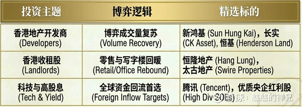 投资技巧: 长实不仅是地产,它还有大量固定收益类的基建资产。在市场波动时,它的高股息率(Dividend Yield)就是安全垫。如果今年会有大规模的回购(Capital Recycling),股价弹性会比新鸿基还大。