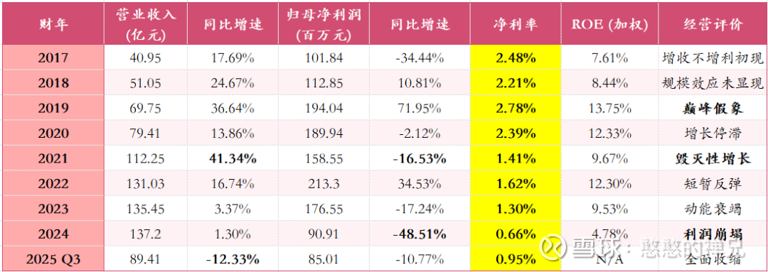 毛利率黑洞:尽管年报摘要中常隐去具体的毛利率数据,但从净利率长期低于3%且一路走低至0.66%可以推断,其综合毛利率极低,且严重依赖于以量换价。(没有产品竞争力,换不出护城河)