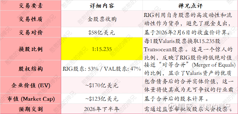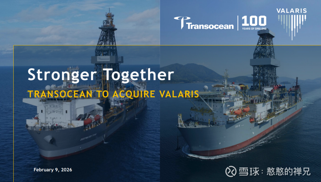 2026年2月9日晚,当Transocean(瑞士越洋钻探,代码RIG)宣布以58亿美元的全股票交易收购Valaris(百慕大注册,代码VAL)时 ,禅兄坐在电脑前,手中盘的核桃微微一顿。这不仅仅是一条新闻,这是全球离岸油气服务行业经历十年“去产能、去杠杆、去库存”的漫长寒冬后,迈向终极整合的里程碑。