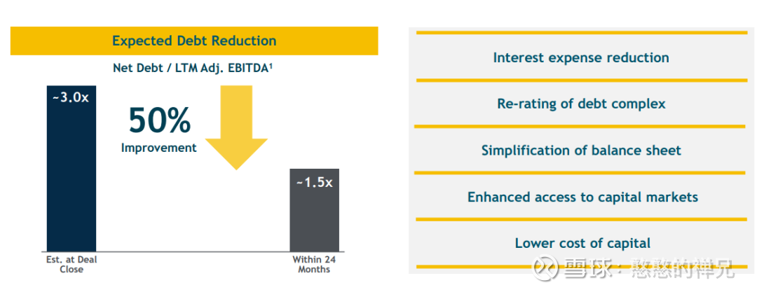 协同效应:2亿美元的成本节约直接转化为2亿美元的EBITDA增量。(下图中右下角标注显示,这些协同效应的现值 (PV) 相当于合并后公司市值的 15%+。这是一个非常诱人的股东回报提升空间。)