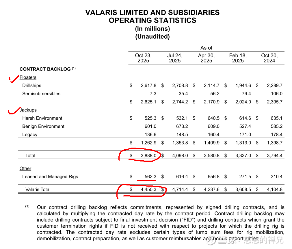 Valaris贡献:约44.5亿美元(包含ARO Drilling的贡献)。截至2025年10月23日,Valaris的总积压订单为 44.5亿美元。相比一年前(2024年10月)的41亿美元,积压订单增长了约 8.4%。其中,钻井船表现亮眼, 浮式平台部分拥有 26.25亿美元 的积压订单,占总额的近 60%,钻井船的订单在过去三个季度稳步回升。半潜式平台(Semis)的积压订单仅剩 730万美元。