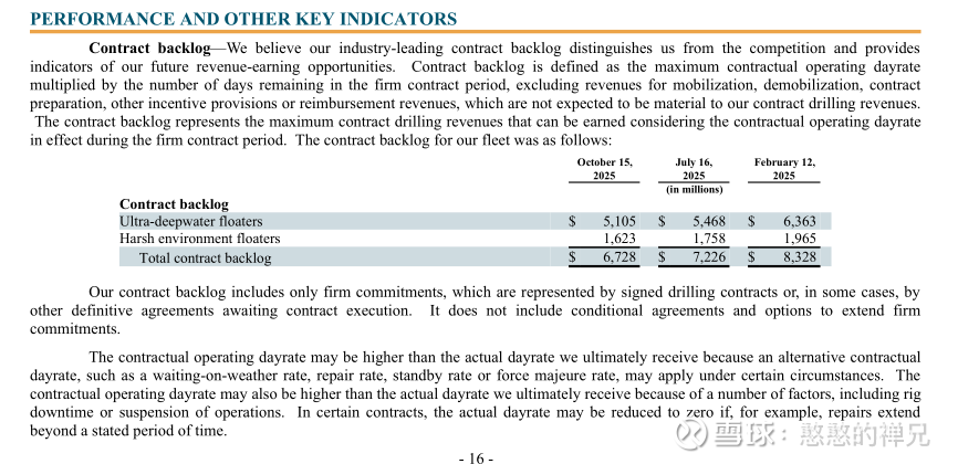 大家注意一下图片中的图表下方的字,这 67.28亿美元 是“裸价”。实际进账的现金流通常会比这个多 5%-10%。动员费(Mobilization fees)通常是现金预付的,这对 RIG 目前的现金流状况非常重要。还有“奖金机会”(Bonus),如果你钻得快,还能多拿钱。这部分全是纯利润。
