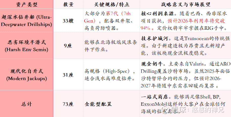 相比之下,Valaris拥有的31座现代化自升式钻井平台(Jackups) 能提供更为稳定、短周期的现金流。浅水钻探往往涉及成熟油田的生产井维护和加密钻井,属于石油公司的“刚需”。这种“深水爆发力”与“浅水稳定性”的结合,是平滑行业周期波动、降低综合资本成本(WACC)的最佳对冲。