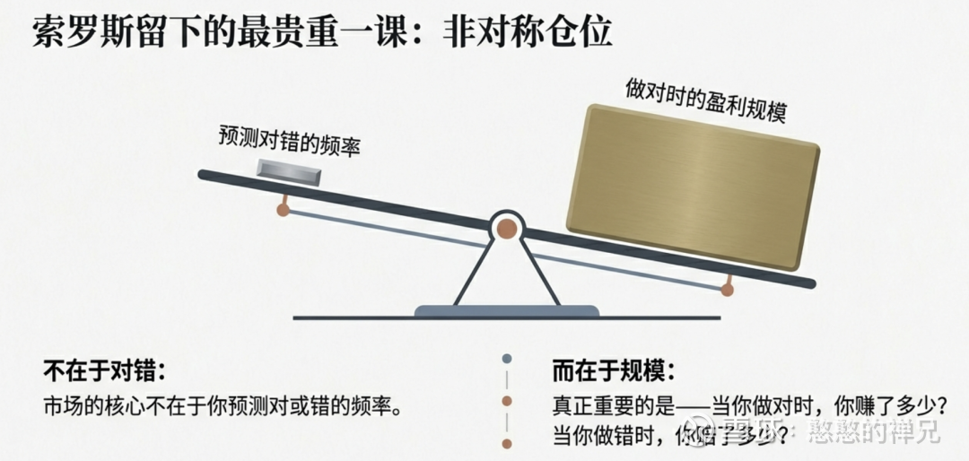 3、索罗斯的核心教诲: 交易的本质不在于你看对或看错的概率,而在于你看对时赚了多少(仓位规模),看错时亏了多少。