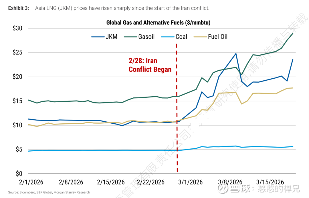 大摩的数据显示,亚洲天然气(JKM)的价格在冲突前大概是11美元左右,现在已经飙升到了24美元附近 。