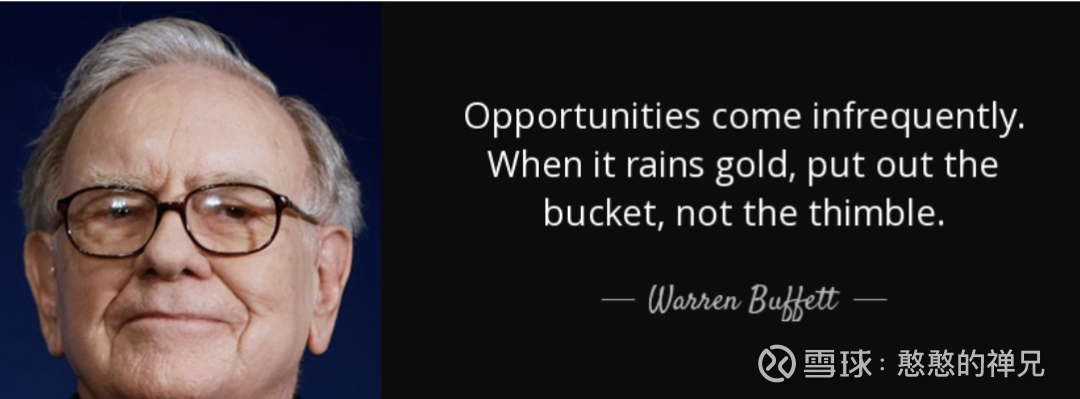 股神巴菲特有句名言:“当天上掉金子的时候,你要拿大桶去接,而不是用顶针。”("Every decade or so, dark clouds will fill the economic skies, and they will momentarily rain gold. When downpours of that sort occur, it's imperative that we rush outdoors carrying buckets, not thimbles.")