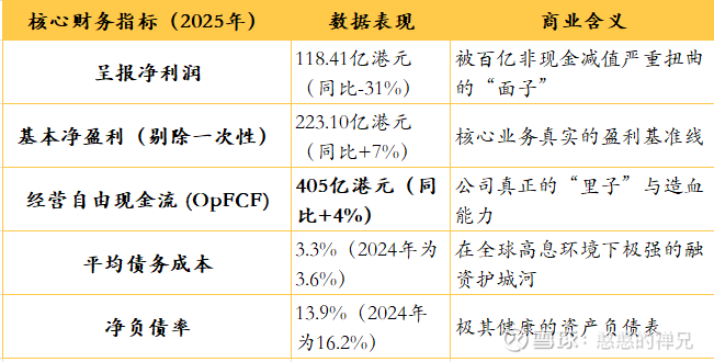 公司全年的“呈报净利润”暴跌了31%(仅剩118.4亿港元),但管理层非但没有削减开支,反而将全年股息提高了5%,且全年的经营自由现金流(OpFCF)逆势增长,达到了惊人的405亿港元。