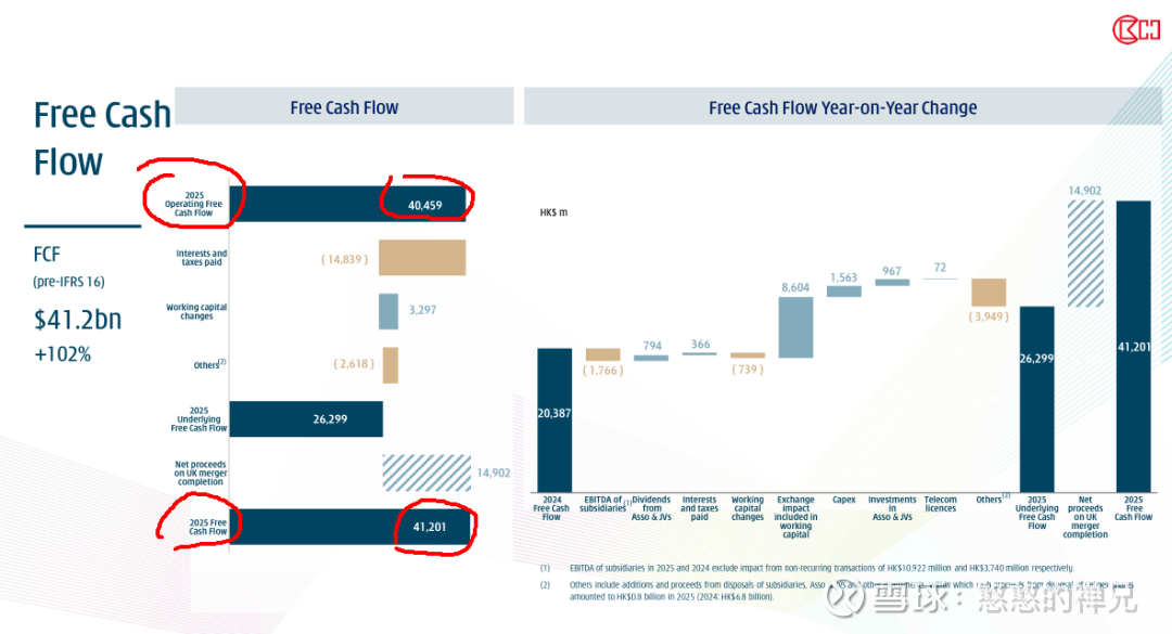 2025年FCF同比+102%至 HK$41.2bn,表面大幅改善,但核心经营自由现金流仅HK$26.3bn,增长的关键驱动来自:一次性资产交易(UK merger完成带来HK$14.9bn现金)。