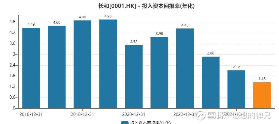 第一,ROIC 与 WACC 的博弈: 财报显示,集团2025年的平均债务成本从3.6%进一步降至3.3%,这是一个极其优秀的低融资成本。然而,由于庞大的投入资本基数,其整体的投入资本回报率(ROIC)通常维持在中低个位数水平。这意味着,长和的 ROIC 可能仅仅是勉强覆盖其加权平均资本成本(WACC),或者产生微薄的正向经济利润(EVA)。