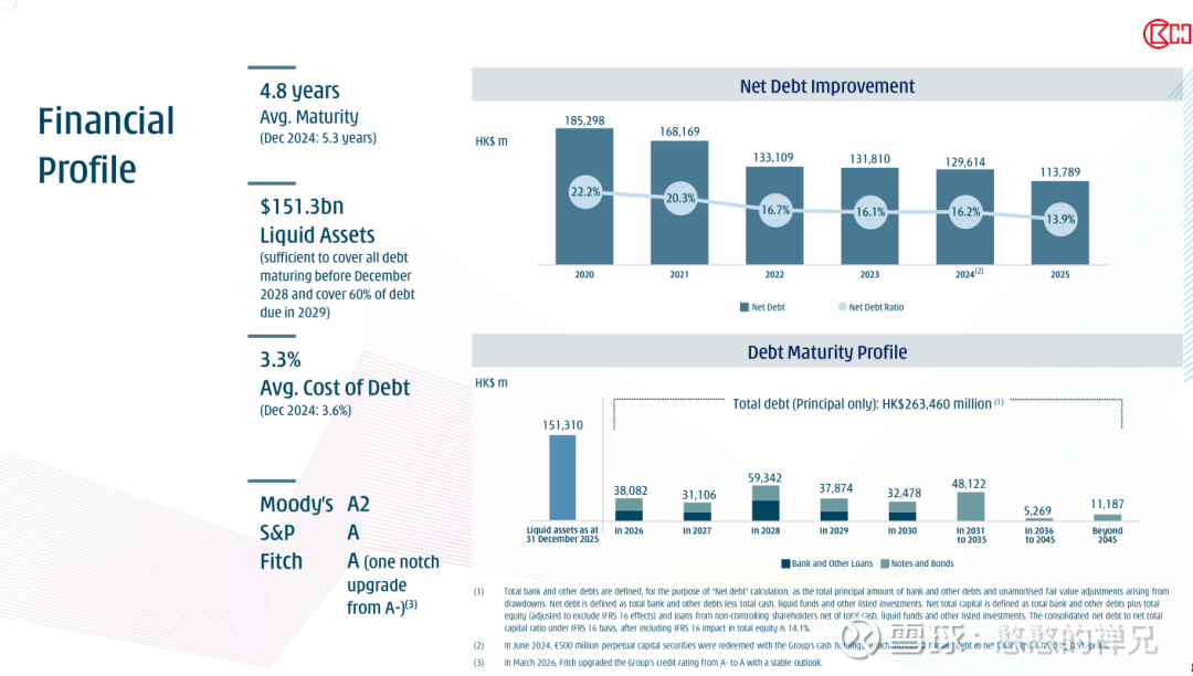 2、现金流与资产负债表:全年的经营自由现金流(OpFCF)达到405亿港元,较前一年增长4% 。年底总债务为2630亿港元,具备良好的到期阶梯结构,且平均债务成本从2024年的3.6%降至2025年的3.3% 。净负债率(Net Debt Ratio)由2024年的16.2%显著改善至13.9% 。