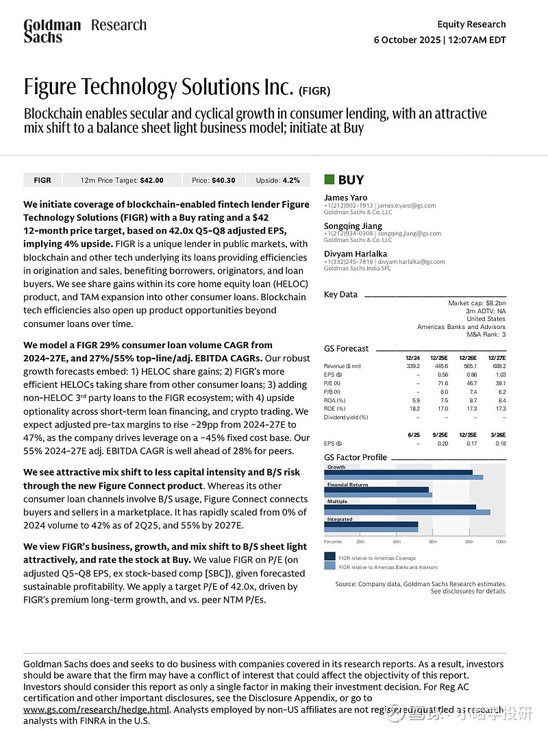 高盛认为,FIGR是一家在公开市场中独特的、由尖端区块链技术驱动的金融科技公司。其技术带来的根本性效率优势,结合强劲的周期性需求和巨大的结构性市场机会,为公司提供了显著的竞争优势和可见的强劲增长路径。同时,其向轻资产的Figure Connect平台的转型,有望降低风险并提升估值倍数。因此,我们给予“买入”评级和42.00美元的目标价。