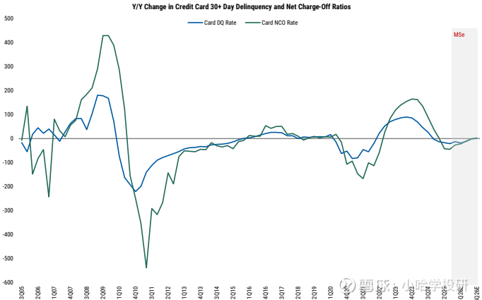 信用卡拖欠率预计在2026年继续同比下降,随后在2026年第四季度趋平。