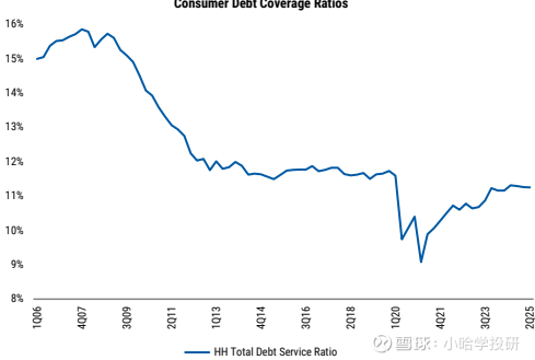 债务覆盖率:消费者债务覆盖率低于历史高点且稳定,抵押贷款和非抵押贷款均表现稳健。