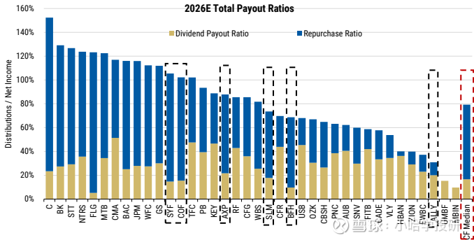 COF:CET1比率达14.4%(含AOCI为13.3%),目标为11%,预计2026/2027年回购134亿/142亿美元(高于共识120亿美元)。