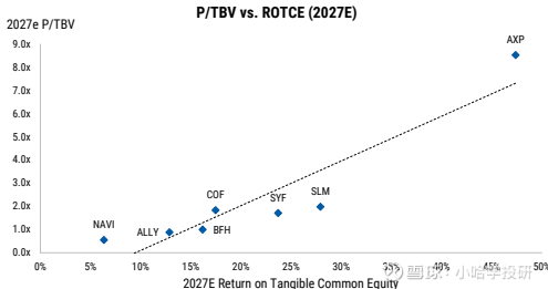 行业头部机构超额资本充裕,股票回购规模将显著增长。COF 凭借 14.4% 的 CET1 比率(含 AOCI 为 13.3%),2026-2027 年预计回购规模达 134 亿 / 142 亿美元;SYF、ALLY 亦将持续推进回购,其中 ALLY 有望从 2025 年零回购增至 2026-2027 年每年 8-9 亿美元。