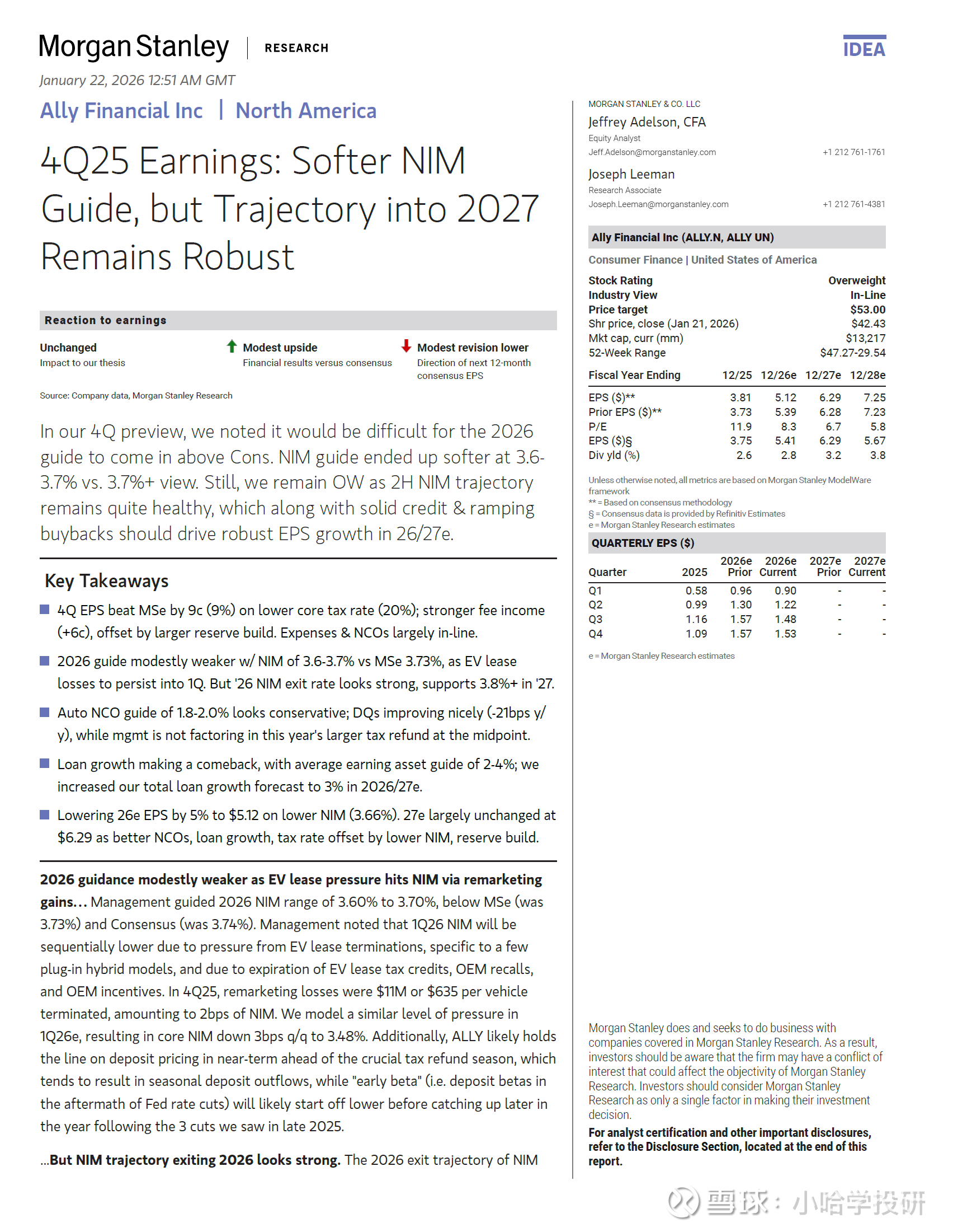 摩根士丹利对Ally维持 “增持”(Overweight) 评级,目标股价为53美元。尽管公司给出的2026年净息差(NIM)指引略低于市场预期,但分析师认为其通向2027年的盈利增长轨迹依然强劲。