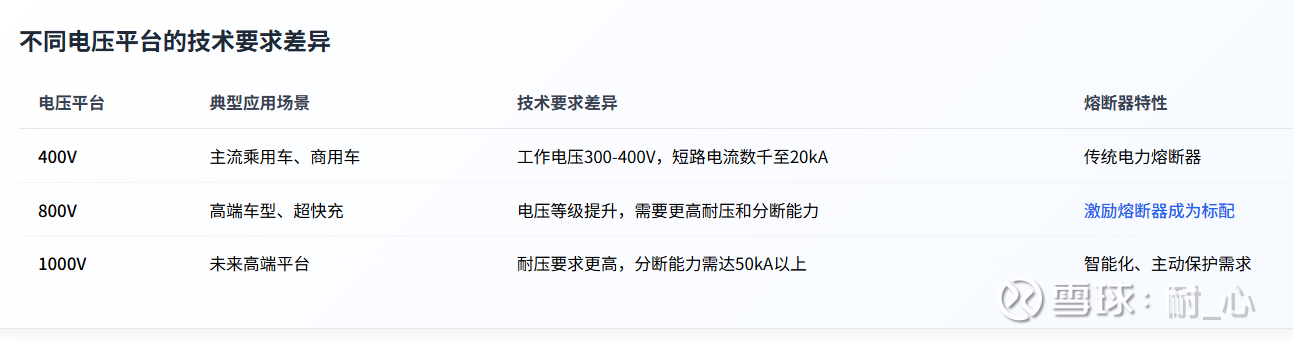 消费者对充电速度、续航里程、安全性的要求不断提高,推动车企持续改进产品设计。车企为了提升竞争力,不断持续的迭代产品,以满足客户需求,传统燃油车开发周期4-5年,新能源车仅2年。而标准制定需要多方参与,协调难度大,且标准多不统一,有国际标准,行业标准,行业标准等。最终标准跟不上技术发展,最终成为定制化产品。主要归纳为3个原因:车企平台差异化需求显著:新能源车电压平台差异大,400V 平台单车熔断器价值量 400 - 600 元,800V 平台则需升级至 1000 - 1200 元,且激励熔断器成为标配,不同车企的电池布局、电控系统设计不同,对熔断器的安装尺寸、分断电流、响应速度要求均不同。例如特斯拉与比亚迪的高压电路拓扑结构存在差异,对应的熔断器参数无法统一。行业标准尚未完全统一:新能源汽车产业化先于标准化,目前全球缺乏统一的高压熔断器法规,既有 JASOD622(日本)、ISO8820 - 7/8 等标准,还存在车企自身的制造标准。且 800 - 1000VDC 等更高电压平台的熔断器,目前尚无完善的认证标准,不同标准下的参数要求冲突,无法形成统一的标准化规格。安全核心属性决定定制化需求:熔断器是新能源车高压电路保护的核心部件,直接关系车辆电池、电控系统安全,一旦故障可能引发热失控等风险。整车厂商在车型设计初期就会让熔断器企业参与前期研发,根据车型的安全设计目标、空间布局、工况极限等定制产品。比如针对固态电池的热失控防护要求,熔断器需匹配特定的温升速率标准,这类定制化需求无法通过标准化产品满足。