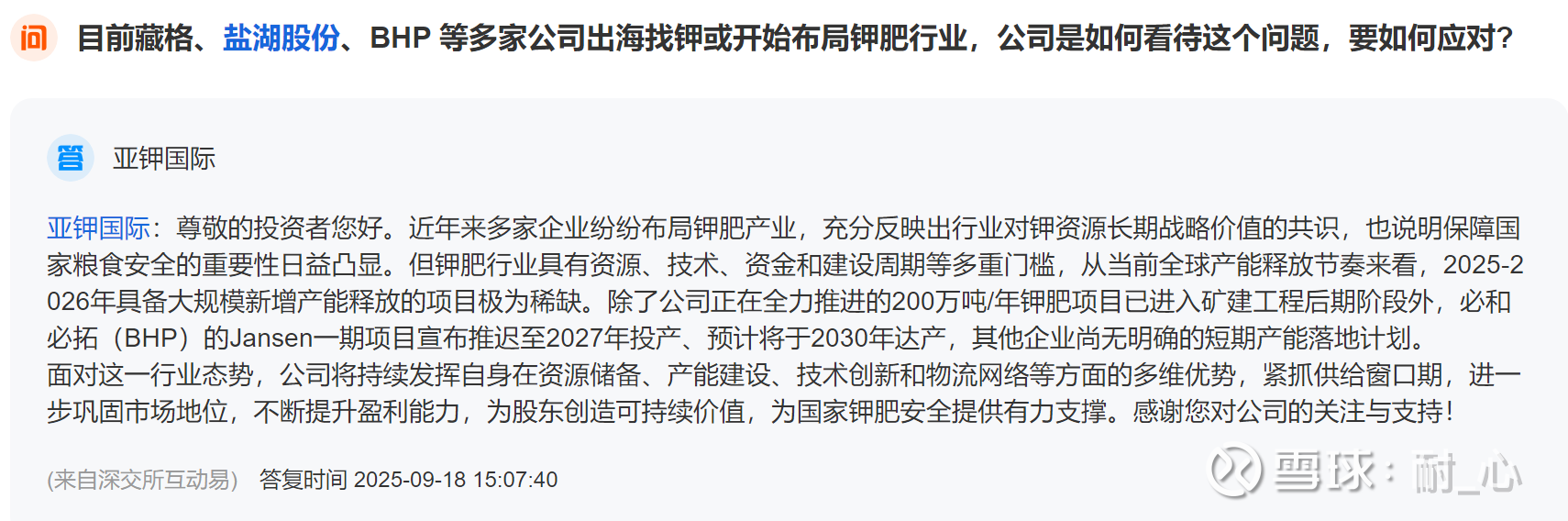 钾肥未来几年供应端增量有限,从市场研报看基本是达成了共识。同时,管理层获得的数据也是如此。大概比较容易得出的结论是,公司未来几年业绩会经历量价齐升的阶段。