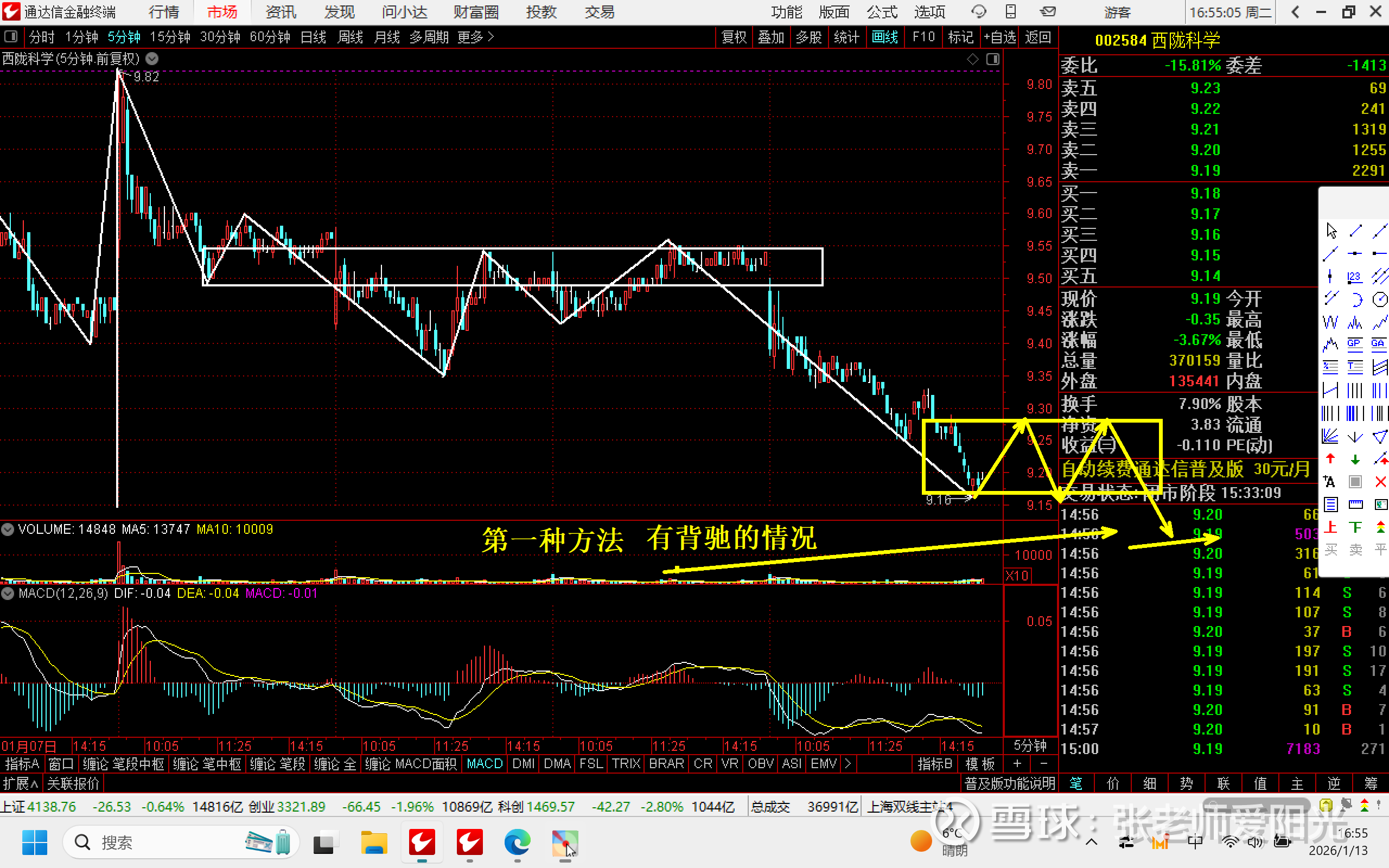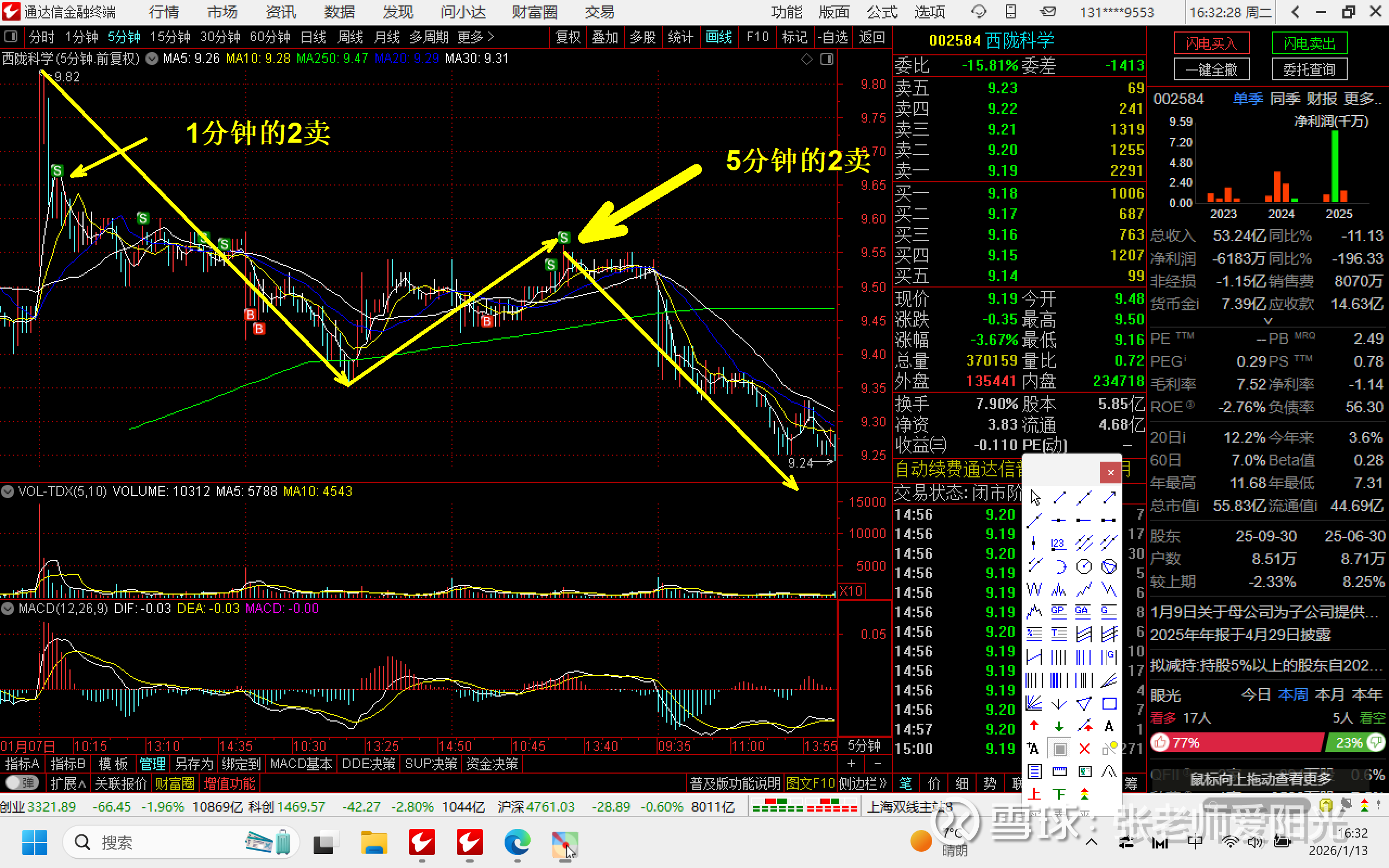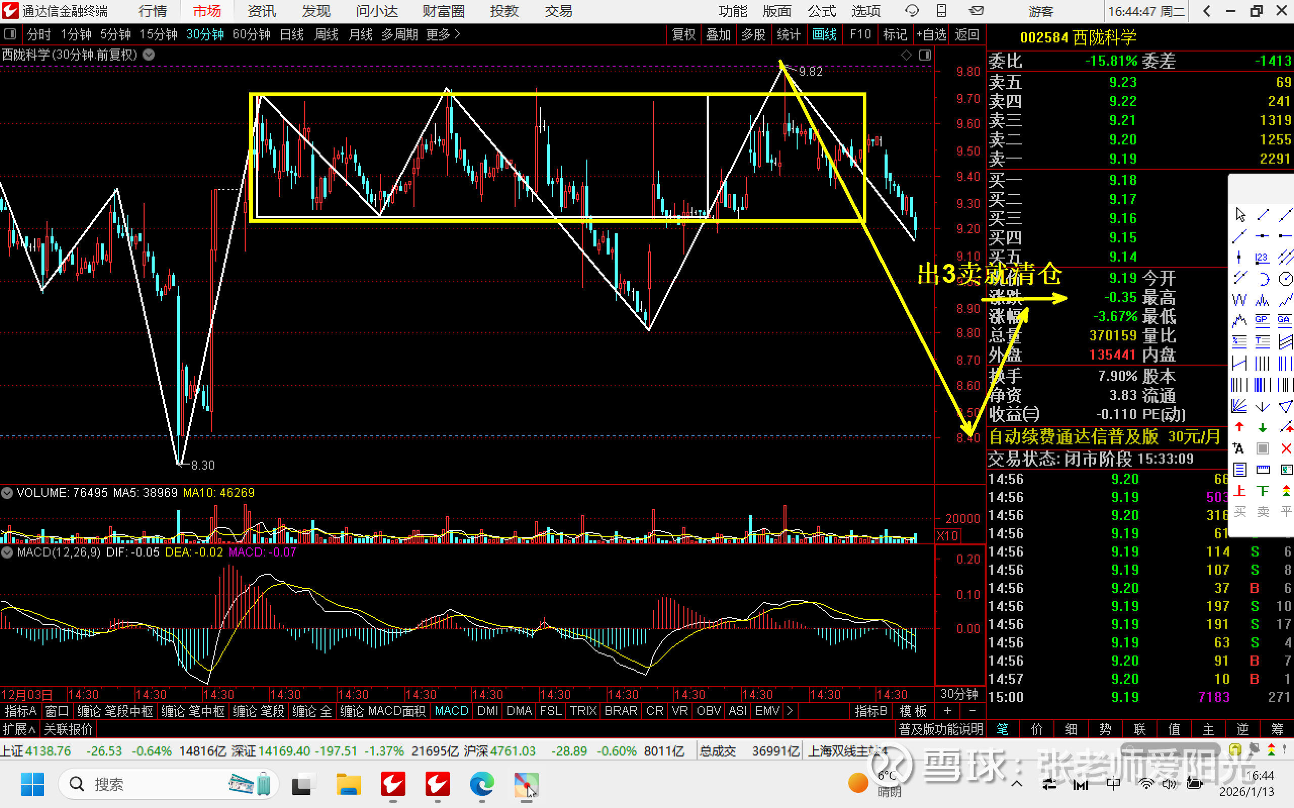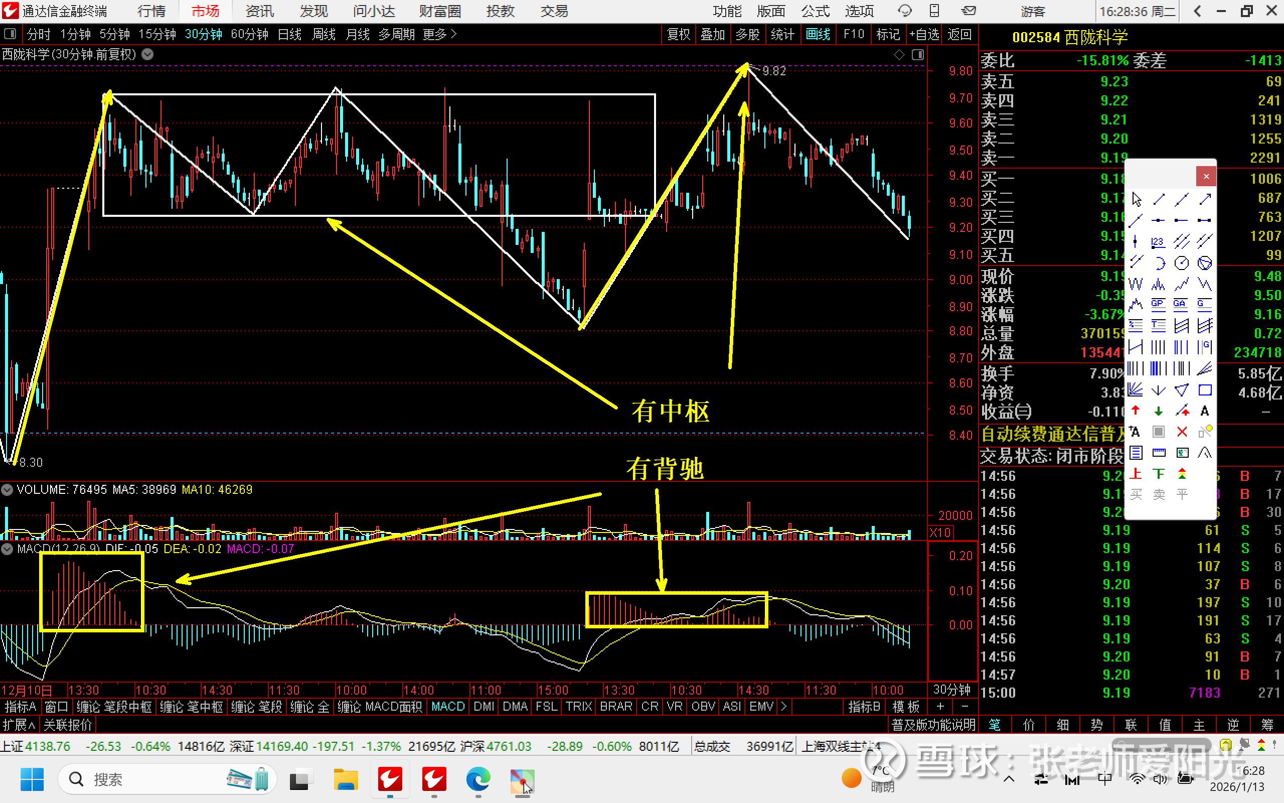 但是我不是卖在最高点9.82,而是在更小的级别里找的相对精确的卖点。就是利用区间套找的1分钟的2卖和5分钟的2卖,这就是买卖点可以不精准,但是节奏不能错。