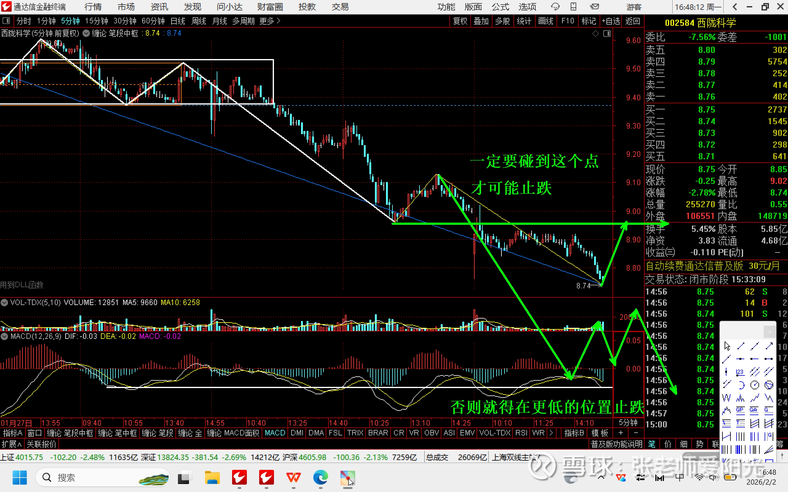 西陇科学明天得碰到周五的最低点,才有可能止跌,否则就得在更低的位置止跌。