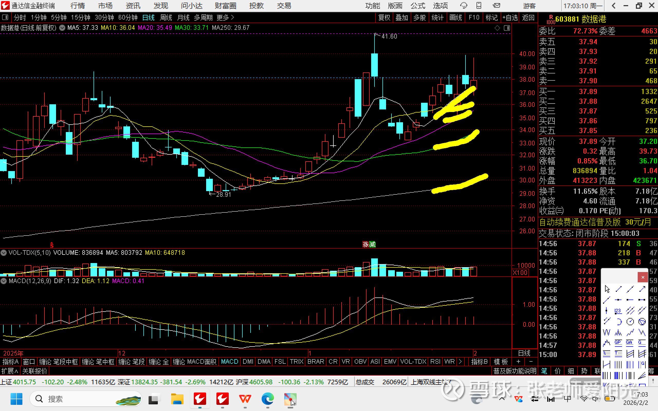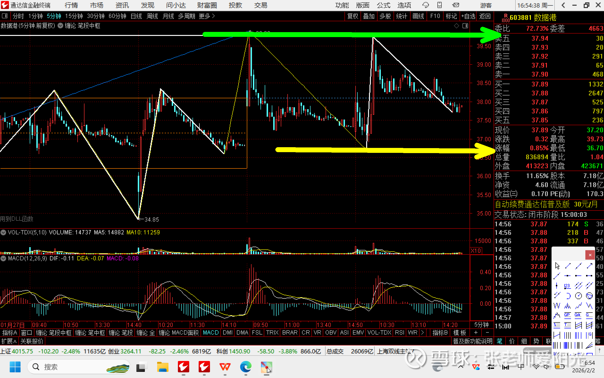 数据港就没有卖点,天天冲高回落,低点却一步一步抬高,只要不瞎操作,不会洗下车或者把自己的成本一步步抬高。以下图绿线为分解线,越不过得卖,越过了不加速得卖。以黄线为接回点,黄线之上接回,黄线之下背驰也要接回,黄线之下加速下跌就不接。5分钟的买卖点要去1分钟图上确认。这种缠论的分析,没有缠论的基础,这种分析看了也白看。