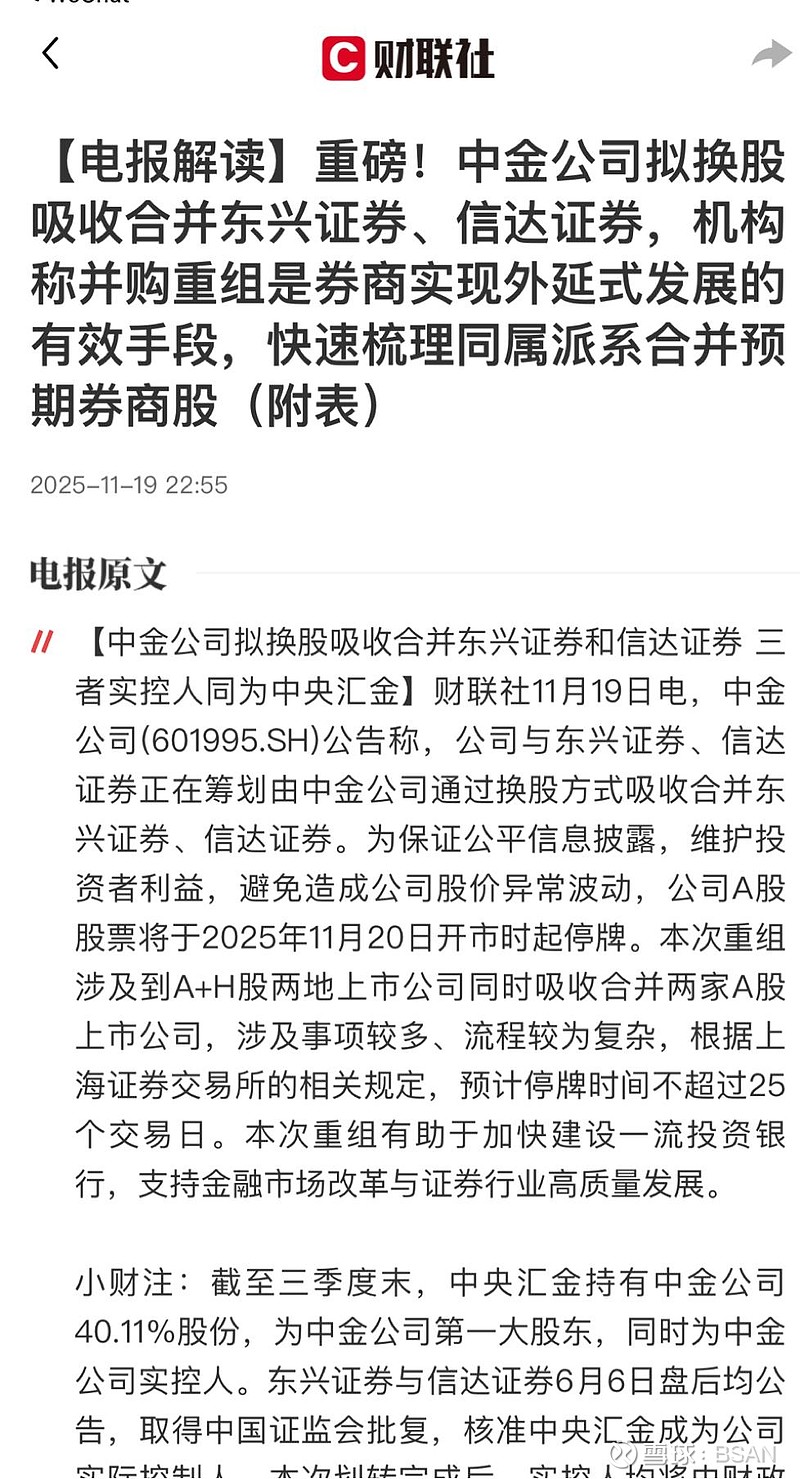 恭喜你们的坚持!很不幸的是,我中金证券和东兴证券都有货!感谢上苍的眷顾,这已经是继海通证券被吸收合并之后,第二次持仓被吸收合并的股票,这次居然是2只