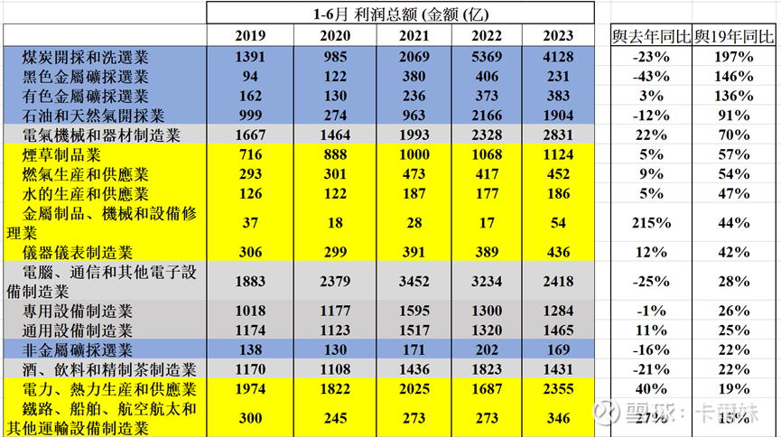 花了点时间,依照发布的数据整理了下过去所有行业41个分类过去几年上半年1-6月间的利润变化,发现数据也挺有趣的,有些行业利润远超19年,有些行业却回不过去了。真的回到那水平的只有19个行业,22个行业回不去。
