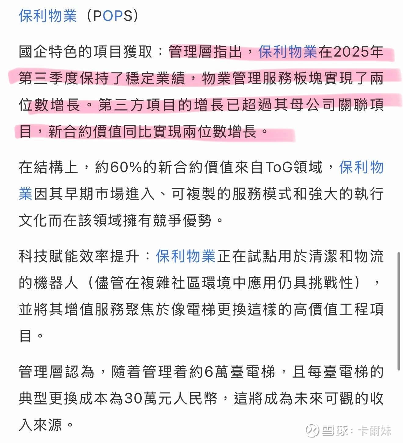 難怪保利物業漲得比較好,MSCI被動增持的也是保利…不過也間接看到一件事,主流的觀感有時和現實不一定是對的。市場預期整個行業是在倒退,但實際還在增長保利管理層早前11月初在與構溝交流提到2025年第三季度保持了穩定業績,物業管理服務板塊實現了兩位數增長,新合約價值同比實現兩位數增長。