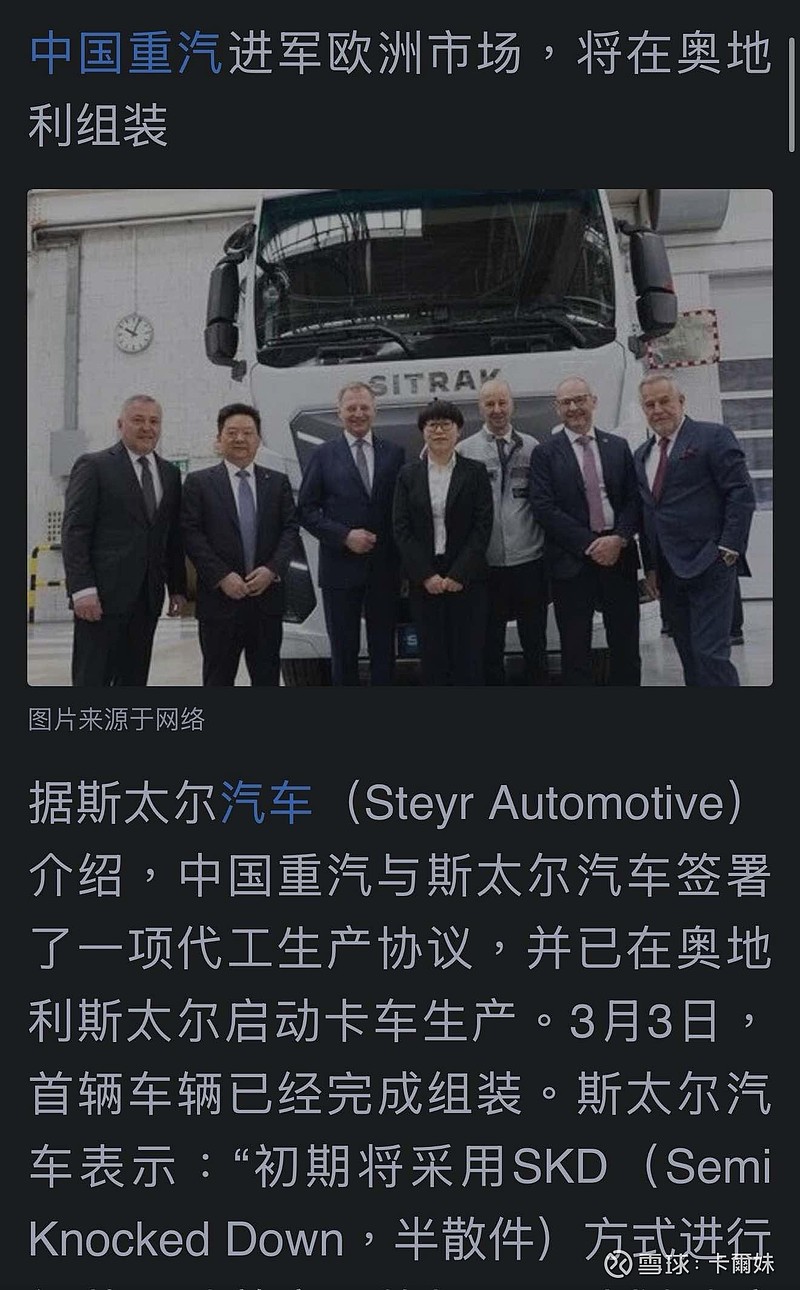 $中国重汽(SZ000951)$ $中国重汽(03808)$ 中國重汽正式進軍歐洲市場了中國重汽與斯太爾汽車簽署了一項代工生產協議,並已在奧地利斯太爾啟動卡車生產。而在3月3日,首輛車輛已經完成組裝。斯太爾汽車表示隨着產量和本地增值環節的增加,公司將逐步擴大員工規模。斯太爾生產的車輛將主要面向EMEA地區客户,歐洲,中東和非洲市場