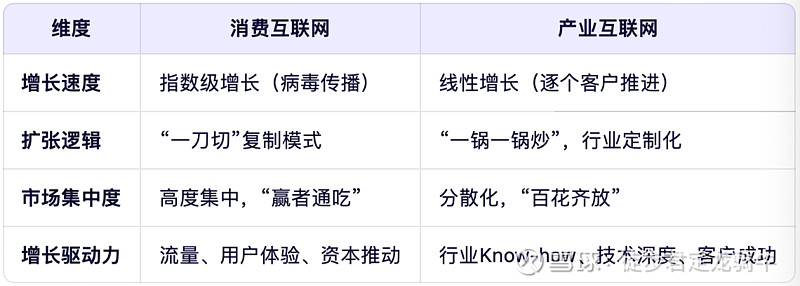 产业互联网则像“深海采珍珠”——每个行业都有独特的流程、标准和痛点,需要深入理解行业知识(Know-how),逐个攻克客户,增长缓慢但价值更深。