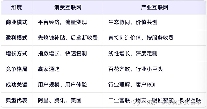 消费互联网:先烧钱,后垄断变现。典型路径:高额补贴 → 快速获取用户 → 形成市场垄断 → 通过广告、佣金、增值服务盈利。
