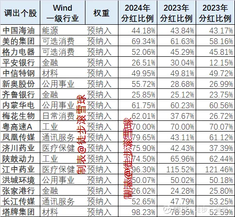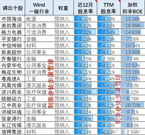 从调入榜看,中国海油、美的集团、格力电器、内蒙华电分红感人,接近50%~60%,这次没有纳入奇怪的东西。