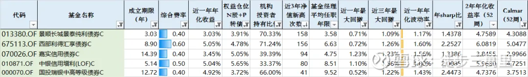 首先,基础筛选:根据iFind的基金三季报数据,共录得固收+基金3654只,排除掉成立不足3年的、规模小于5亿的、机构持仓占比不足25%且不高于85%的、近一年卡玛比率小于2的、夏普比例小于1的、剔除费率超过0.8%的、权益仓位占比低于10%,还剩131只。