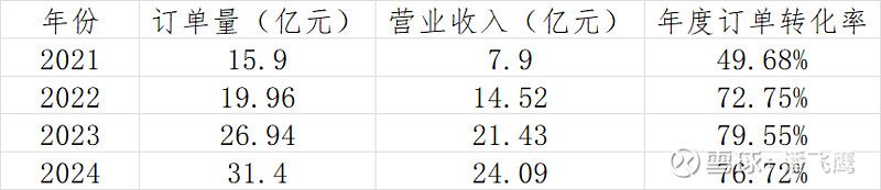 收入:2021-2024年公司订单量分别为15.90/19.96/26.94/31.40亿元,营收分别为7.90/14.52/21.43/24.09亿元,根据41.37亿,取均值75%,收入31亿